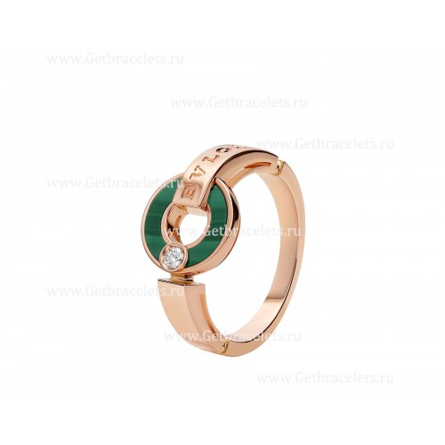 Zlatý prsten BVLGARI BVLGARI s prolamovaným vzorem a malachitovými prvky a kulatým diamantem s briliantovým brusem.