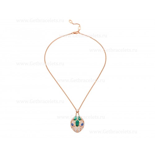 Náhrdelník Bvlgari Serpenti z 18karátového růžového zlata s modrými safírovými očky, malachitovými prvky a dlážděnými diamanty na přívěsku.