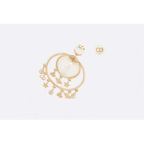 Dámské náušnice Dior Tribales ze žlutého zlata s přívěsky s květinami/včelami/hvězdami/CD a asymetrickými perlami.